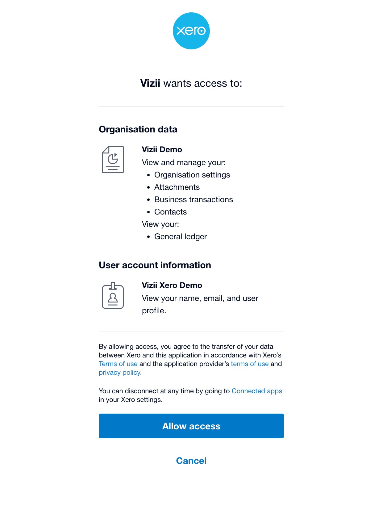 Click on "Allow access", That it, now let Vizii do its magic! your data will take a few minutes to sync, however, the fetching process could take more time depending on how much data is available in Xero. Note: Vizii fetches 5 years worth of data.